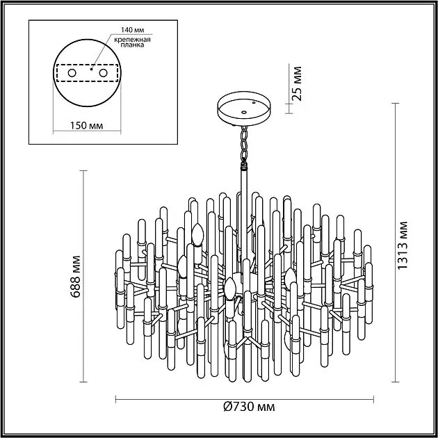Краткие технические особенности: Высота люстры — 1313 мм, ширина — 730 мм; степень пылевлагозащиты IP20; класс электробезопасности I; бренд — ODEON LIGHT; стиль — модерн, серия — STIKA. Подходит для установки в сухих помещениях, не предназначена для использования в ванных комнатах или на улице.